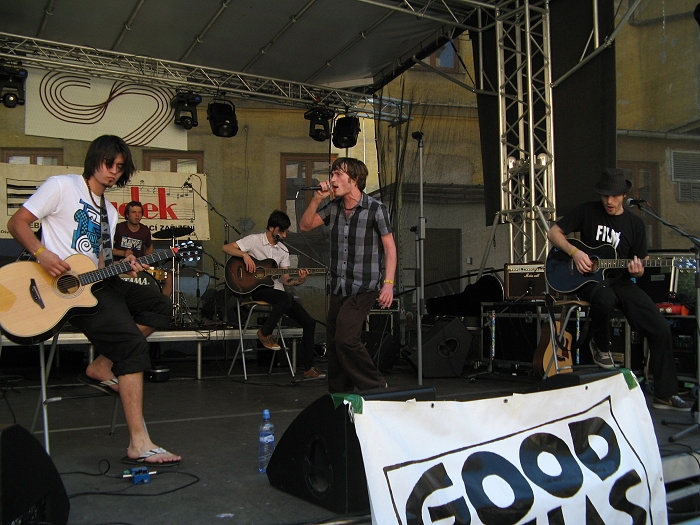 První festivalový den, tedy pondělí 28.6., dle programu začínal ve 12 hodin místní punk-rockovou kapelou Treska a electronica-rockovou Hrozněmoc. V této době jsem však teprve nastupovala do autobusu směr Plzeň. Po chvilce motání se po městě jsem konečně vkročila na dvůr Církevního gymnázia, kde akorát dozvučili akustičtí Goodfellas. Po dlouhé době (alespoň co se týče mnou navštívených koncertů) zase hráli s Mattem, bubeníkem, který z kapely z časových důvodů před pár měsíci odešel a kterého nahradili Tokhi a producent skupiny Honza Horáček. Bylo vidět, že ve staré sestavě se jim hraje nejlíp a že si to o poznání víc užívají. Fanouškům představili další z nových kousků jejich připravovaného alba.