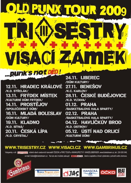 Legendy české punkové scény skupiny Tři sestry a Visací zámek konečně vyráží na první společné turné! A opravdu se máte na co těšit! Obě party se již čtvrt století pohybují na tuzemských pódiích a to, že nejsou žádní děd(k)ové vám dokáží během čtyřhodinové koncertní jízdy! Každá kapela zahraje samostatný průřez celým svým tvůrčím obdobím a pár dnes již zlidovělých hitů si zahrají společně!