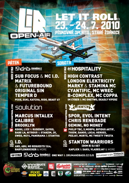 Třetí ročník Let It Roll open air festivalu nabízí nabušený program. 10 let Drumandbass.cz se nejdříve oslaví na hlavní stagi v pátek s Ridem a Beastem 67, dále zahraje Katcha a dvojka Suki & Pixie. Doplní tak šestici Sub Focus feat. MC I.D., Matrix & Futurebound, Original Sin a Temper D. Soul:ution night v Radio 1 Take Control stanu kromě Calibra a Marcuse Intalexe ovládnou Brooklyn, Koogi, Sayko, Babe LN, Lixx & Rudeboy, Nitrous & Stanzim, 2K & Sweg, M4Y4, Panorama & Stantha. Na Wakata stagi si užijeme dubstepový set britského producenta I.D. a dále nás zlomí Abu, ANS, Babylonrocker a mnozí další. Čtvrtou stage si na oba dny postaví partička Drumandbass.cz ve VIP stanu, kde bude pokračovat oslava jubilea. Těšit se můžete na polské hosty One Way a dále na skvadru Beast 67, Soldik, C.N.B, Freakox, Skiny, Cyrax a D.N.S.