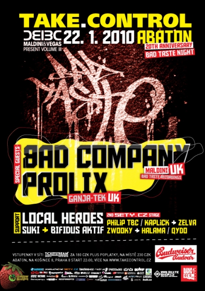 22. ledna oslaví drum & bassová party Take Control svoje 20. vydání. Pozvání na jubilejní díl přijal DJ Maldini, jeden ze členů legendární britské partičky Bad Company. Na noci ve znamení labelu Bad Taste Recordings se dále představí i další ze zástupců tohoto vydavatelství, DJ Prolix.