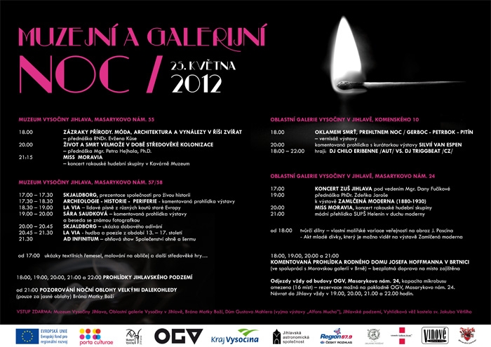 Projekt Porta Culturae ve spolupráci s Muzeem Vysočiny Jihlava a Oblastní galerií Vysočiny v Jihlavě pořádá v pátek 25. května 2012 od 17:00 do 22:00 Muzejní a galerijní noc 2012.