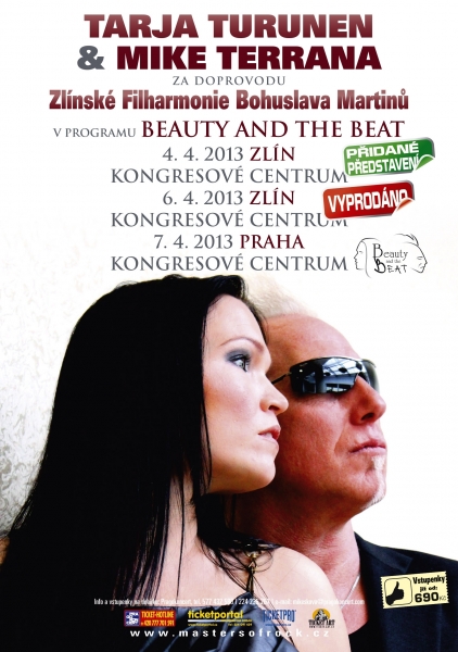 Ano a neuvěřitelné se stalo skutkem! Fenomenální metalové duo TARJA TURUNEN a MIKE TERRANA ve své hudební show "Beauty and The Beat", podtrženou dokonalou harmonií zlínské Filharmonie Bohuslava Martinů 2x zcela vyprodalo sál zlínského Kongresového Centra a poslední přidaný termín (5. 4.) se také rychle blíží vyprodání a tak, pro velký zájem, šly do prodeje nová přidaná místa na všechny tři zlínské termíny! Pořádající agentura Pragokoncert navýšila standardní kapacitu Kongresového centra Zlín o bezmála stovku dalších křesel, a to skutečně na všechny tři koncertní dny, tj. 4., 5., i 6. dubna. Přístavky, které tvoří křesla stejné kvality jako jsou ta pevně usazená, jsou v prodeji! Vstupenky objednávejte v předprodejních sítích Ticketportal a Ticketpro a objednávejte na webu www.mastersofrock.cz. 7. 4. 2013 pak Tarja a Mike vystoupí v Kongresovém Centru v PRAZE!