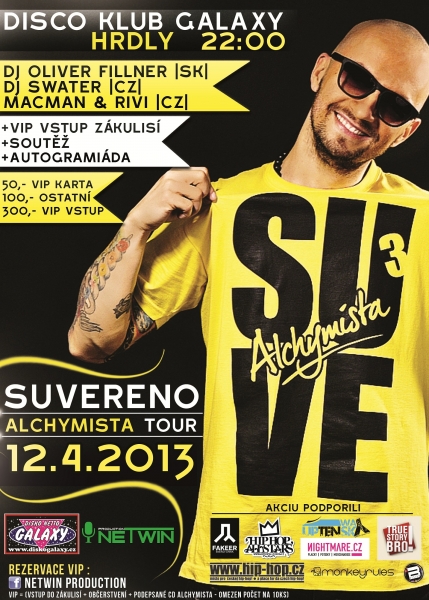Slovenský, velmi úspěšný raper Suvereno, který na konci minulého roku vydal nové album Alchymista, zahájil v březnu 2013 turné na Slovensku. Nyní zahajuje svou pouť také v České republice.
