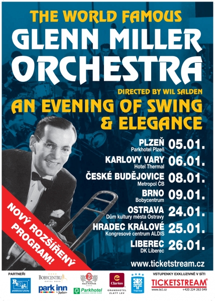 Glenn Miller Orchestra se po roce opět vrací do ČR! Proslulý orchestr odehraje po republice v průběhu ledna osm koncertů, kde představí svůj nový program nazvaný The Best of Glenn Miller Orchesrta. Uskupení je v Česku velmi populární, hity jako „Moonlight Serenade“ či „In the Mood“ si chodí poslechnout naživo stovky lidí a koncerty bývají často rychle vyprodány.