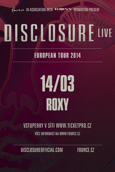 Do Prahy zavítá vůbec poprvé v historii britská elektronicko-housová dvojka DISCLOSURE. Premiérová show vůdčích představitelů britského elektronického synthpopu se uskuteční 14. března 2014 v pražském klubu Roxy. Vstupenky jsou v prodeji v síti Ticketpro.