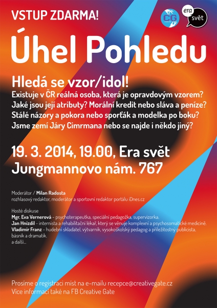 Coworkingové centrum Creative Gate hledá vzor/idol! Pomůžou mu k tomu zajímaví hosté, moderátor a především diváci na další diskusi Úhel pohledu, která proběhne ve středu 19.3.2014 od 19 hodin v prostoru Era svět na Jungmannově náměstí. Hledání se tentokrát zúčastní mladý moderátor Milan Radosta a hosté diskuse Jan Hnízdil, Vladimír Franz, Eva Vernerová.