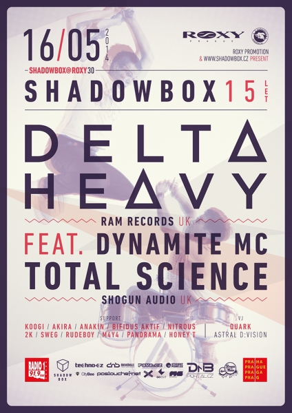 Legendární crew SHADOWBOX oslaví v květnu 15 let a doporučujeme držet si klobouky a narozeninové čapky, protože pofičíme z kopce! Kromě kompletní SHADOWBOX crew na obou stagích vystoupí londýnská úderná dvojka Delta Heavy, oxfordský projekt Total Science a MC Dynamite. Vše nejlepší!