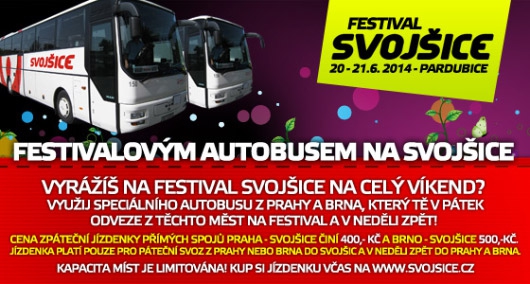 Pro zájemce z Prahy a Brna bude vyrážet speciální festivalový autobus v pátečních odpoledních hodinách. Cena zpáteční jízdenky přímých spojů Praha – Svojšice činí 400,-Kč a Brno – Svojšice 500,-Kč. Návrat festivalového autobusu bude v neděli po skončení hlavního programu festivalu. Kapacita míst je limitována a proto doporučujeme zakoupit si jízdenku včas. Kompletní informace o registraci jízdenky naleznete na www.svojsice.cz/doprava.