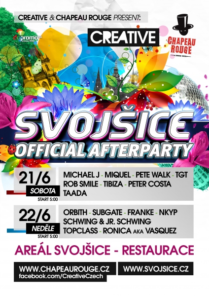 Orbith, Subgate, Franke, Michael J, Miquel, Rob Smile, TGT, Tibiza, Pete Walk, Ronica, Nkyp a řada dalších na oficiální afterparty po festivalu Svojšice v sobotu 21.6. a neděli 22.6.!
