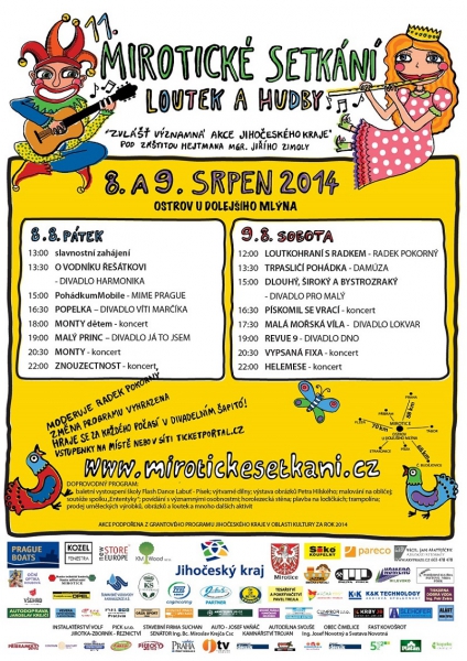 MIROTICE (PÍSECKO) – Dvoudenní divadelně - hudební festival pro malé i velké MIROTICKÉ SETKÁNÍ LOUTEK A HUDBY vstupuje již do 11.ročníku. Za uplynulou dekádu si vybudoval nezpochybnitelné postavení na kulturní mapě Čech, o čemž svědčí i fakt, že byl již pošesté vybrán a zařazen mezi "Zvlášť významné akce Jihočeského kraje“ pod záštitou hejtmana Jiřího Zimoly. Letošní ročník proběhne 8.– 9. srpna opět v útulném prostředí na ostrově u Dolejšího mlýna.