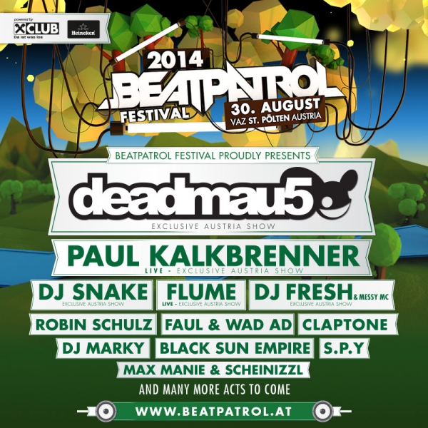 Jako jeden z headlinerů zde vystoupí jeden z nejúspěšnějších techhouse a electro producentů, kanadský hitmaker DEADMAU5. Bude se dokonce jednat o jeho jediný letošní gig v Rakousku a v rámci svého setu představí své zbrusu nové album nazvané ‘while(1<2)’. Po pěti letech se na Beatpatrol vrátí Paul Kalkbrenner, hvězda filmu Berlin calling. Dále se zde představí drumandbassová legenda DJ Fresh s MC Messym, hip hopový producent DJ Snake, který se proslavil hity jako ‘Bird Machine’ nebo ‘Turn Down For What’, Australan Flume, čerstvý držitel 4 cen ARIA Awards, nebo Robin Schulz, který se svým remixem skladby ‘Waves’ (originál od Mr. Probz) sesadil z první příčky žebříčků Pharrella Williamse a nyní vévodí žebříčku iTunes se skladbou ‘Prayer in C’.