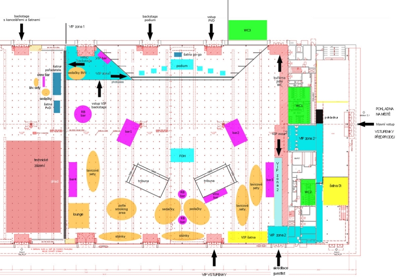 Z plánku jsou patrné VIP sektory 01 a 02, dále posílené toalety, venkovní část pro grilované občerstvení, za zmíňku jistě stojí rozdělení vchodu pro nákup vstupenek na místě, z předprodeje, VIP a akreditace.