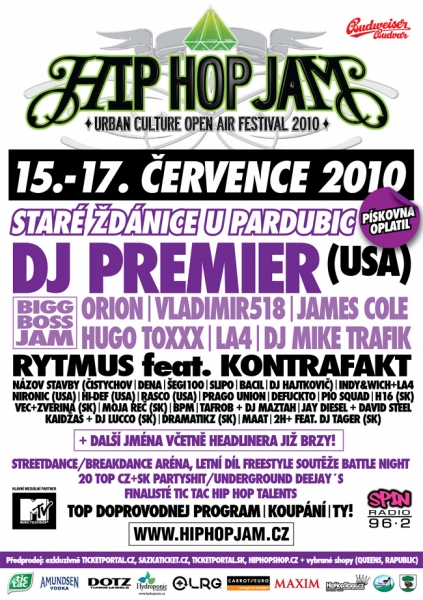 Rádi bychom širokou veřejnost upozornili na blížící se konec levnějšího předprodeje 3denních permanentek na letošní 4. ročník letního urban culture festivalu Hip Hop Jam 2010 (www.hiphopjam.cz), který se uskuteční třetí prázdninový víkend 15.-17. července 2010 v luxusním přírodním „koupacím“ areálu pískovny Oplatil na hranici obce Staré Ždánice mezi Pardubicemi a Hradcem Králové.