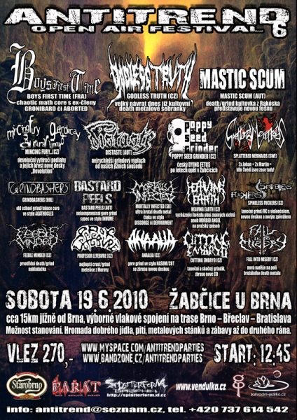 V sobotu 19. června se již pošesté rozezní malebným vesnickým areálem ta nejvěrnější a nejsyrovější zvěrstva, kterých je nejen tuzemská extrémní scéna schopná. V příjemném, přírodou obklopeném a alkoholem dobře zásobovaném, areále v Žabčicích u Brna se bude konat již tradiční open-air festival Antitrend, jež má pro tentokrát pořadové číslo 6. Pokud jste fanoušky náročného technického death metalu, chaotického math coru, surového death/grindu, ultra rychlého grindu či taneční grind/crust fůze, je tento festival určen právě vám…