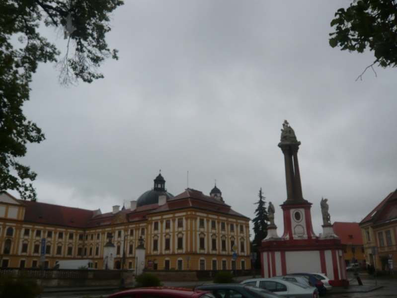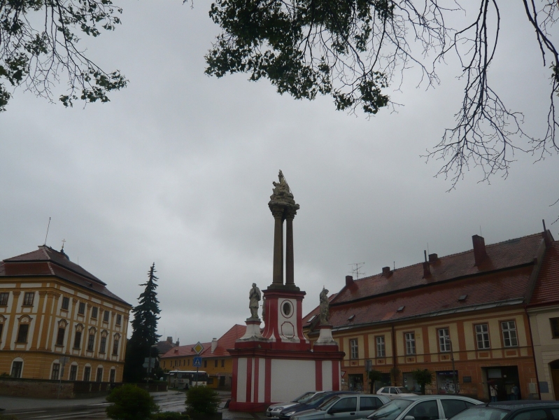 Byl vztyčen roku 1716. Dvoustupňový podstavec na půdoryse trojúhelníka s uťatými rohy nese trojici soch – sv. Karla Borrmejského, sv. Rocha a sv. Šebestiána - a trojici sloupů s kompozitními hlavicemi, na kterých spočívá sousoší Nejsvětější Trojice. Při opravě v roce 1898 byly původní sochy od Štěpána Pagana nahrazeny kopiemi.