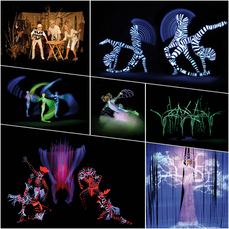 Představení Afrikania vypráví o setkání manželského páru na jejich exotické dovolené a poštovního doručovatele, který se nečekaně ocitne v pozici recepčního opuštěného hotelu. Příběh se prolíná s působivými obrazy krajiny Afrikanie, plné rozmanitých zvířecích druhů, jimž vdechnou život nejnovější černodivadelní technika, netradiční kostýmy i profesionální taneční výkony. Přírodou inspirovaná scénografie a diváka obklopující projekce dotvářejí atmosféru tohoto fantazijního světa, do něhož Vás zveme na netradiční výlet.