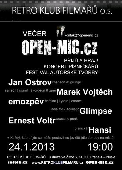 Večer OPEN-MIC.cz nabízí všem písničkářům skvělou příležitost zahrát si a setkat se se svým publikem! Malinký komorní sál klubu pojme cca 20-27 diváků, čímž se naskýtá možnost bezprostředního osobního kontaktu písničkáře a diváka a takové setkání v sobě nese extrémní nebezpečí vzniku přátelství i hudebního spříznění.