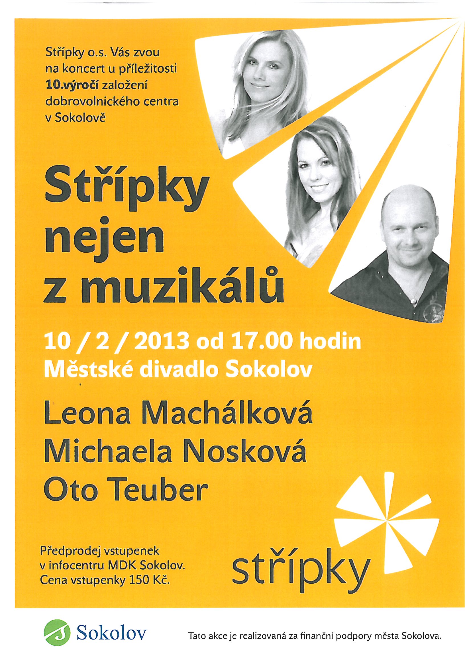 Střípky o. s. pořádají koncert u příležitosti 10. výročí založení dobrovolnického centra v Sokolově. Vystoupí Leona Machálková, Michaela Nosková, Oto Teuber. Tato akce je realizována za finanční podpory města Sokolova.