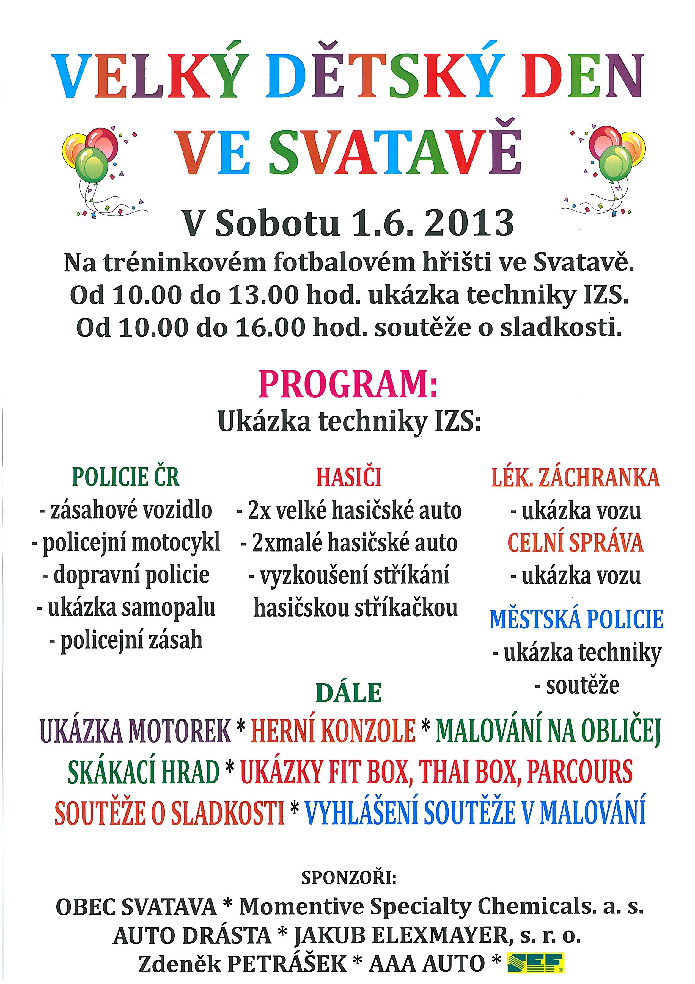 Ukázka techniky IZS (Policie ČR - zásahové vozidlo, policejní motocykl, dopravní policie, ukázka samopalu, policejní zásah), Hasiči (2x velké a 2x malé hasičské auto, vyzkoušení stříkání hasičskou stříkačkou, Lékařská záchranka - ukázka vozu, Celní správa - ukázka vozu, Městská policie - ukázka techniky, soutěže)