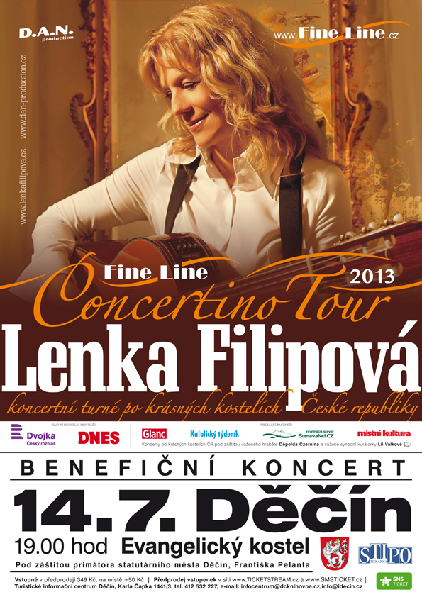 Lenka Filipová musela kvůli povodním přesunout termín koncertu v Děčíně v rámci Fine Line Concertino tour 2013, které odstartovala letos na jaře. Děčínský koncert byl původně plánován na 3. 6. 2013. Pořadatelé oznamují termín nového koncertu, který se uskuteční 14. 7. 2013 od 19.00 hod. v evangelickém kostele v Děčíně.