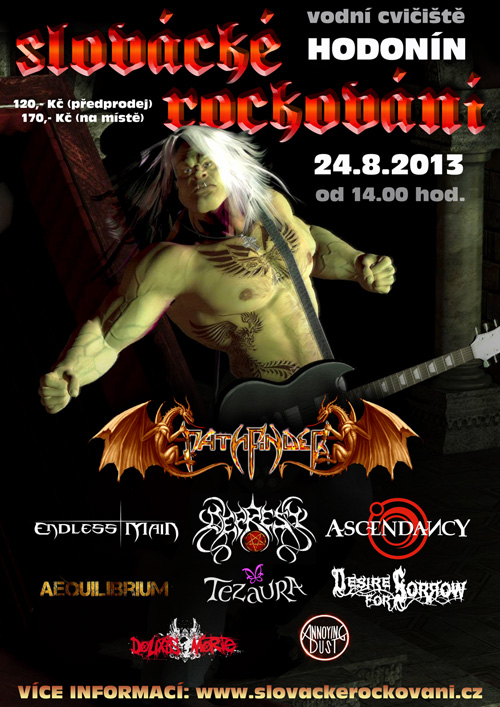 Účinkující: 14:00 – otevření areálu 15:00 – 15:45 – DOUXIS MORTE 16:05 – 16:50 - AEQUILIBRIUM 17:10 – 18:00 – DESIRE FOR SORROW 18:30 – 19:20 – ENDLESS MAIN (SK) 19:50 – 20:40 - TEZAURA 21:20 – 22:20 – PATHFINDER (PL) 22:50 – 23:40 - ASCENDANCY 00:00 – 00:50 – DEPRESY (SK) 01:10 – 01:50 – ANNOYING DUST