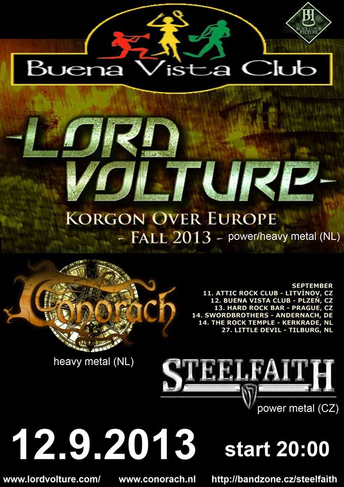 LORD VOLTURE (NL), jakožto nadcházející hvězda tohoto žánru v Evropě, si na své evropské tour vzali bratry ve zbrani CONORACH (NL), a rozhodně chtějí dokázat, že si tenhle punc zaslouží. Support jim bude dělat kapela STEELFAITH (CZ), která z drsného českého severu přiveze porci speed metalu. Plzeň by si rozhodně tento koncert neměla nechat ujít, i když se jedná o čtvrtek 12.9., neboť je to malej pátek…