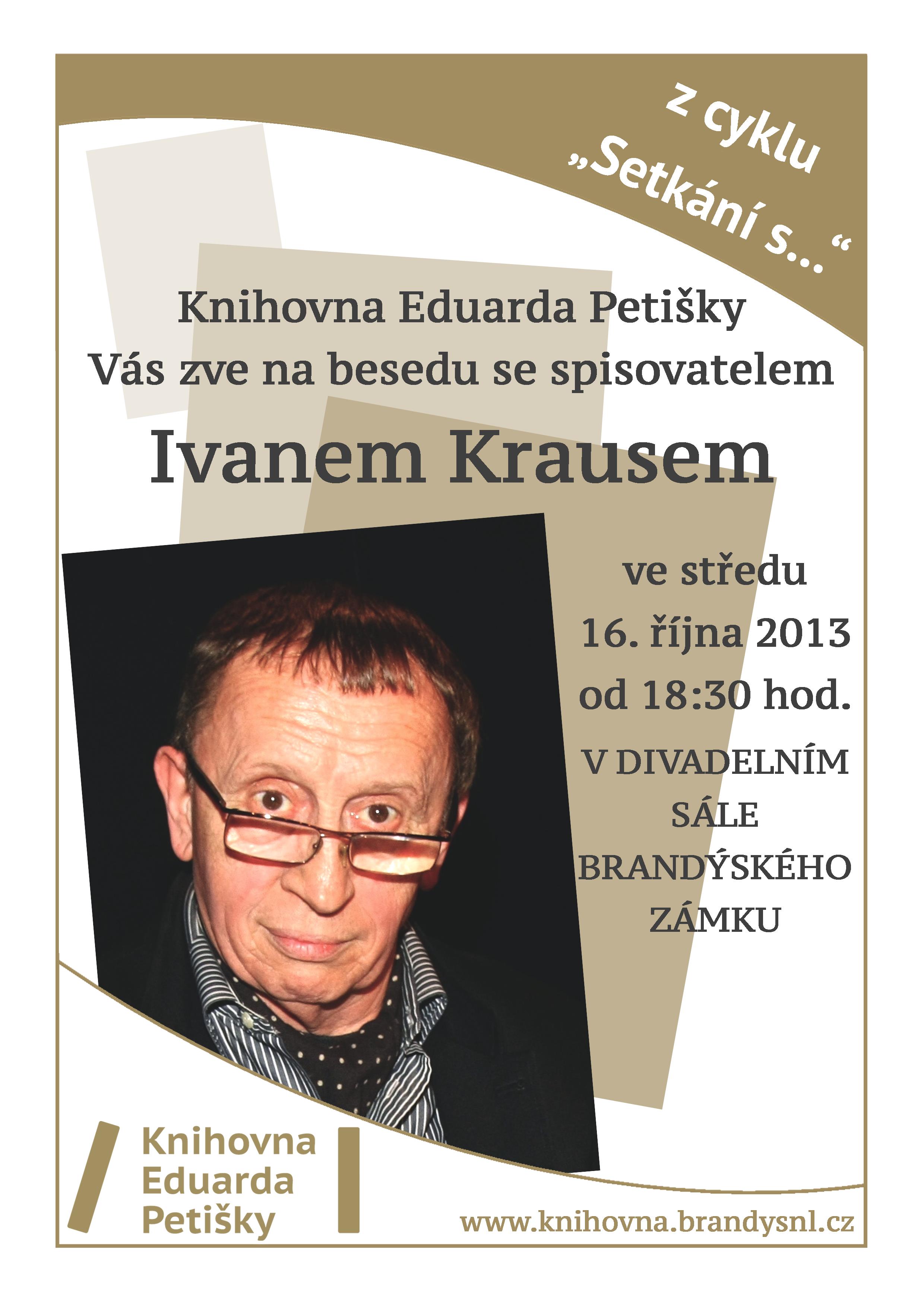 Spisovatel, herec a loutkář Ivan Kraus bude mít 16. října besedu v Brandýse nad Labem. Akci pořádá Knihovna Eduarda Petišky a proběhne na zámku v divadelním sále od 18:30 hod.