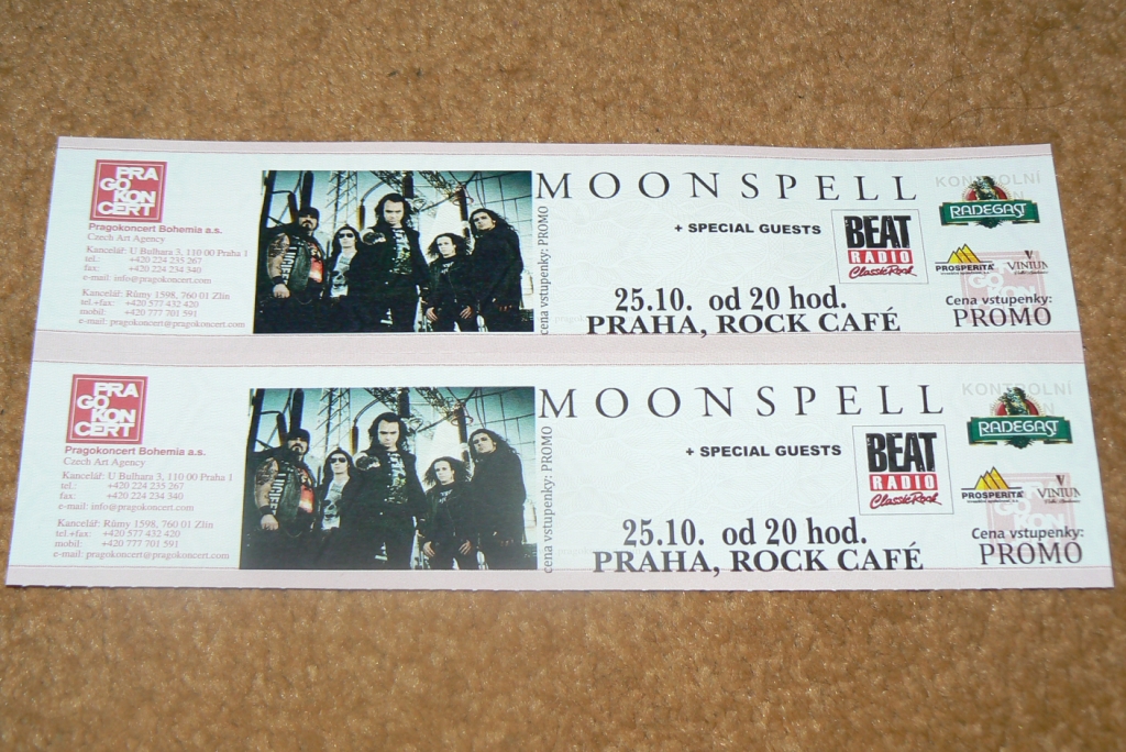 Prodám 2 vstupenky na na koncert skupiny MOONSPELL v Praze v Rock Café dne 25.10.2013 od 20 hod. Cena jedné vstupenky 500 Kč. Při rychlém jednání sleva. Předám osobně v Praze.