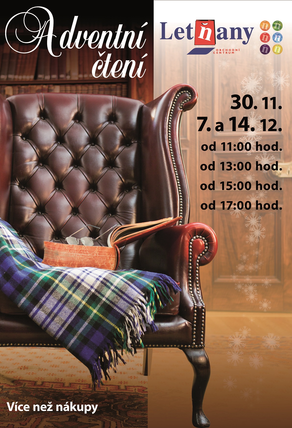 Obchodní centrum Letňany připravilo pro své návštěvníky Adventní čtení a Veřejnou knihovnu, unikátní projekt, který má přispět ke zvolnění předvánočního tempa a zpříjemnění adventního období nakupujícím. Lidé se usadí do útulných křesel a zaposlouchají se do živě čteného slova. Veřejné předčítání proběhne o adventních sobotách 30. 11., 7. 12. a 14. 12., vždy čtyřikrát denně, a to od 11:00, 13:00, 15:00 a 17:00. Dopolední 11. hodina bude věnována literatuře pro děti a mládež. Akci doprovodí soutěž o hodnotné ceny.