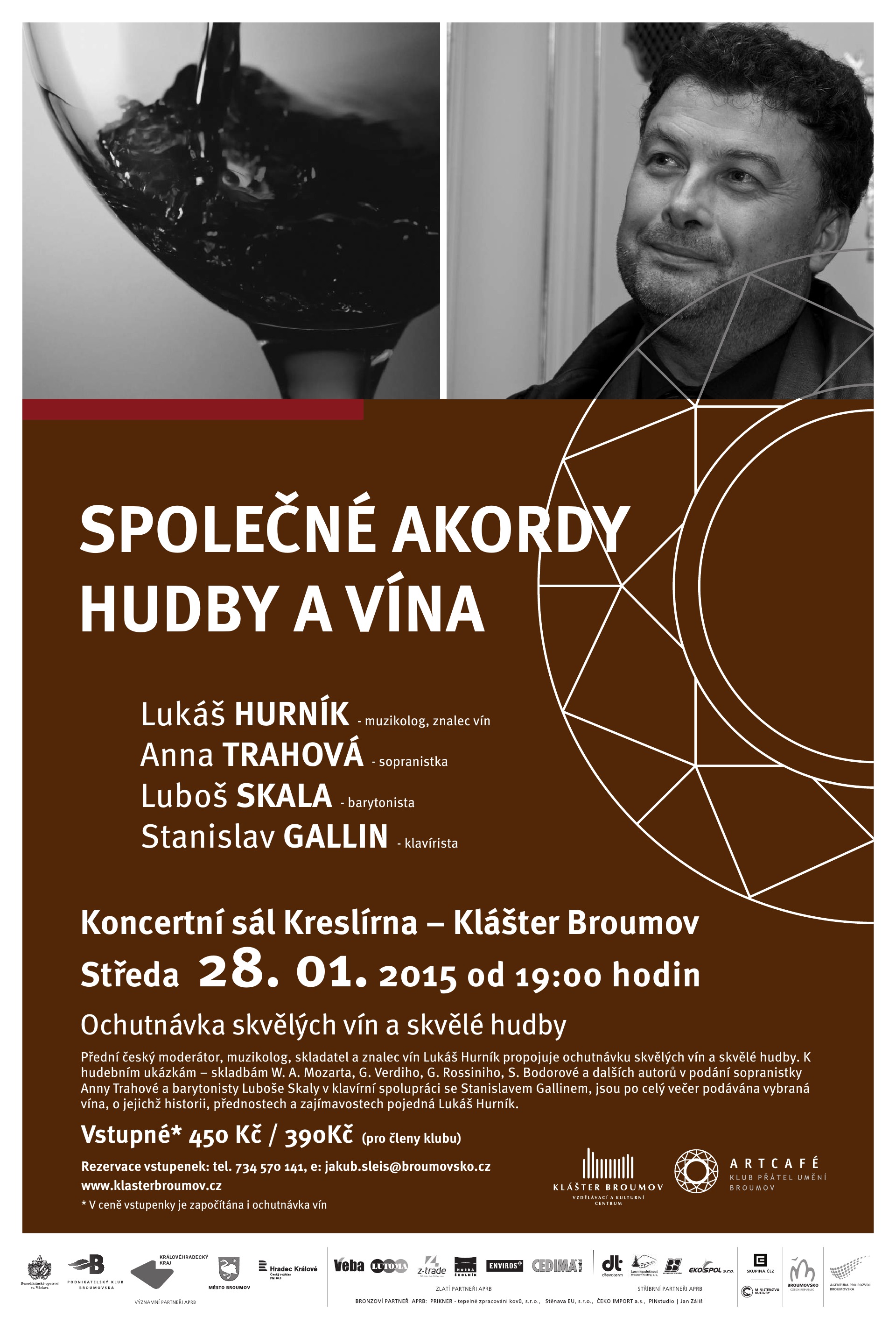 Přední český moderátor, muzikolog, skladatel a znalec vín Lukáš Hurník propojuje ochutnávku skvělých vín a skvělé hudby. K hudebním ukázkám – skladbám W. A. Mozarta, G. Verdiho, G. Rossiniho, S. Bodorové a dalších autorů v podání sopranistky Anny Trahové a barytonisty Luboše Skály v klavírní spolupráci se Stanislavem Gallinem, jsou po celý večer podávána vybraná vína, o jejichž historii, přednostech a zajímavostech pojedná Lukáš Hurník.