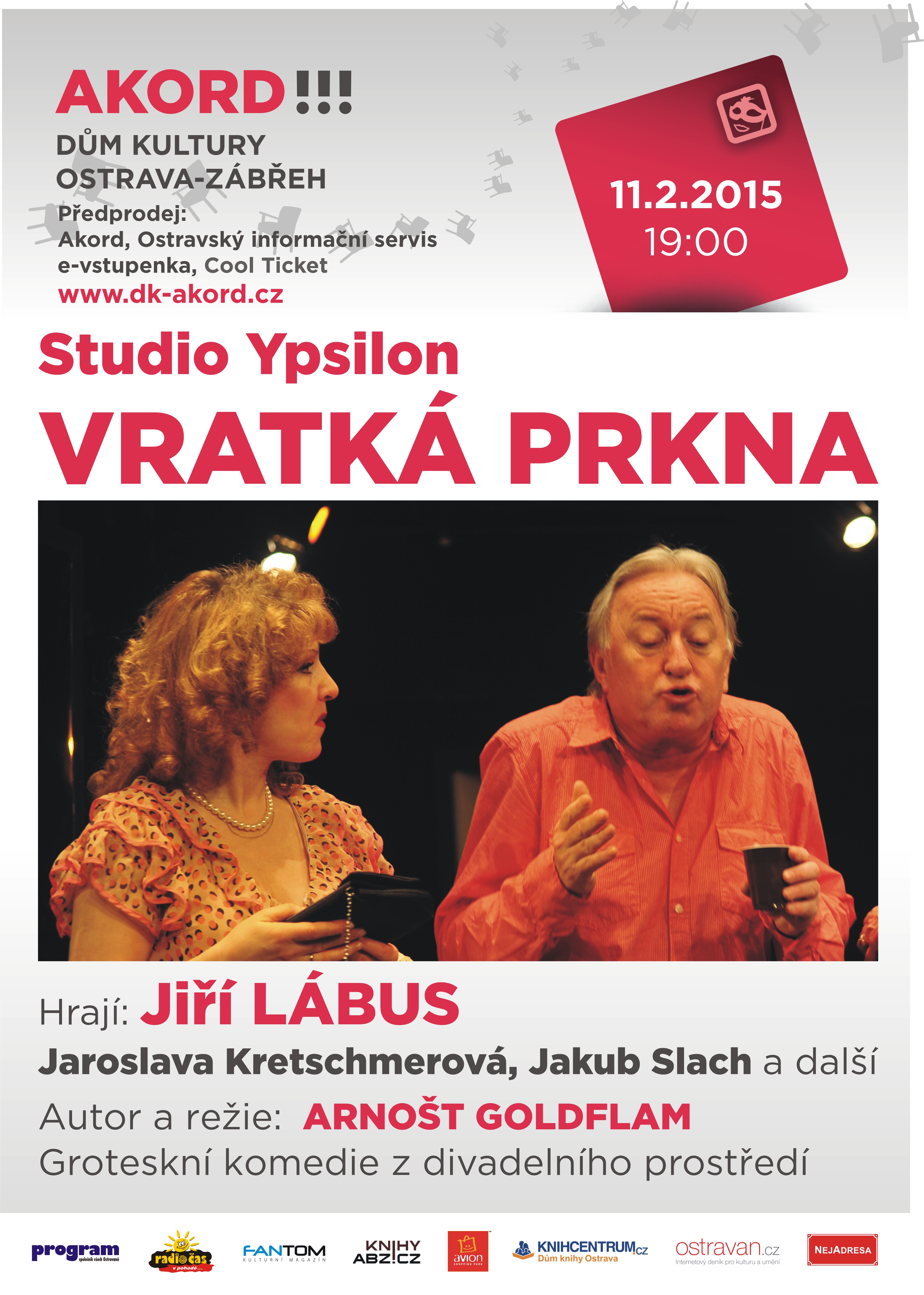 Imponuje Vám divadelní zákulisí? Ve středu 11.02.2015 v 19:00 hodin máte jedinečnou příležitost nechat se Jiřím Lábusem, Jaroslavou Kretschmerovou a dalšími z ansámblu pražské Ypsilonky vtáhnout do groteskního divadelního panoptika. Panoptika, ve kterém se umělý svět prolíná s tím skutečným bez jasně daných hranic. Přijďte si prožít komedii VRATKÁ PRKNA a spolu s herci se pomyslně projít po oněch divadelních prknech, která znamenají svět. Svět bez jistot, svět, v němž touha po uznání, penězích a slávě je o to intenzivnější.