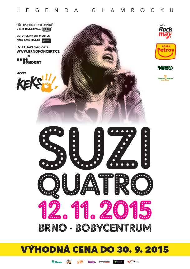 Suzi Quatro - energií stále sršící nestorka rock and rollu a první frontwoman rockové historie se vrací do ČR! Po úspěšném vystoupení v brněnské Hale Vodova na podzim 2013 odehraje v ČR dva velké koncerty na podzim roku 2015: ve středu 11.listopadu ve Velkém sále Lucerny v Praze a o den později v brněnském Bobycentru. Tato dáma s „baskytarou zavěšenou proklatě nízko“ přijede s hutnou rockovou show, v rámci které zazní všechny zásadní písně jejího repertoáru: od A Girl Like Me, přes Rocking In the Free World čí Can the Can po samozřejmě nesmrtelné Stumblin In a If You Can’t Give Me Love.
