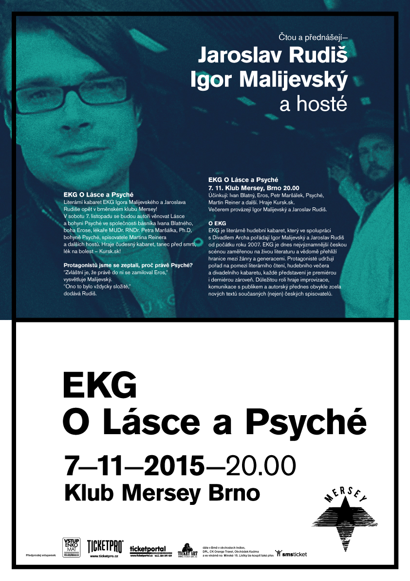 Literární kabaret EKG Igora Malijevského a Jaroslava Rudiše opět v brněnském klubu Mersey! V sobotu 7. listopadu se budou autoři věnovat Lásce a bohyni Psyché ve společnosti básníka Ivana Blatného, boha Erose, lékaře MUDr. RNDr. Petra Maršálka, Ph.D, bohyně Psyché, spisovatele Martina Reinera a dalších hostů. Hraje čudesný kabaret, tanec před smrtí, lék na bolest - Kursk.sk!