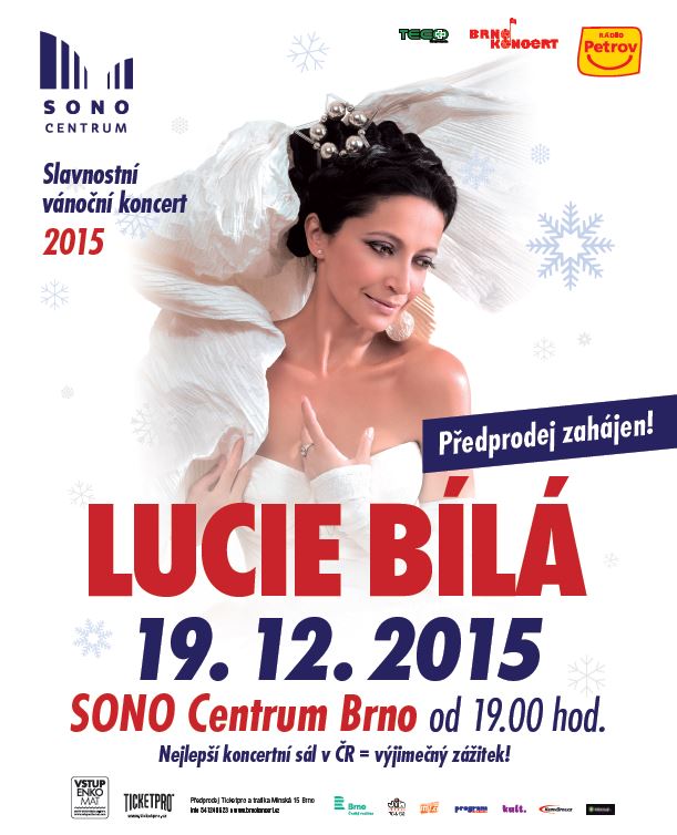 Vánoční koncert Lucie Bílé a jejích hostů, který se měl konat 19.12.2015 v sále Bobycentrum v Brně, se z technických důvodů (konání muzikálu Děti Ráje) přesouvá do sálu s nejlepším zvukem a akustikou – Sonocentrum na ulici Veveří 113 v Brně.