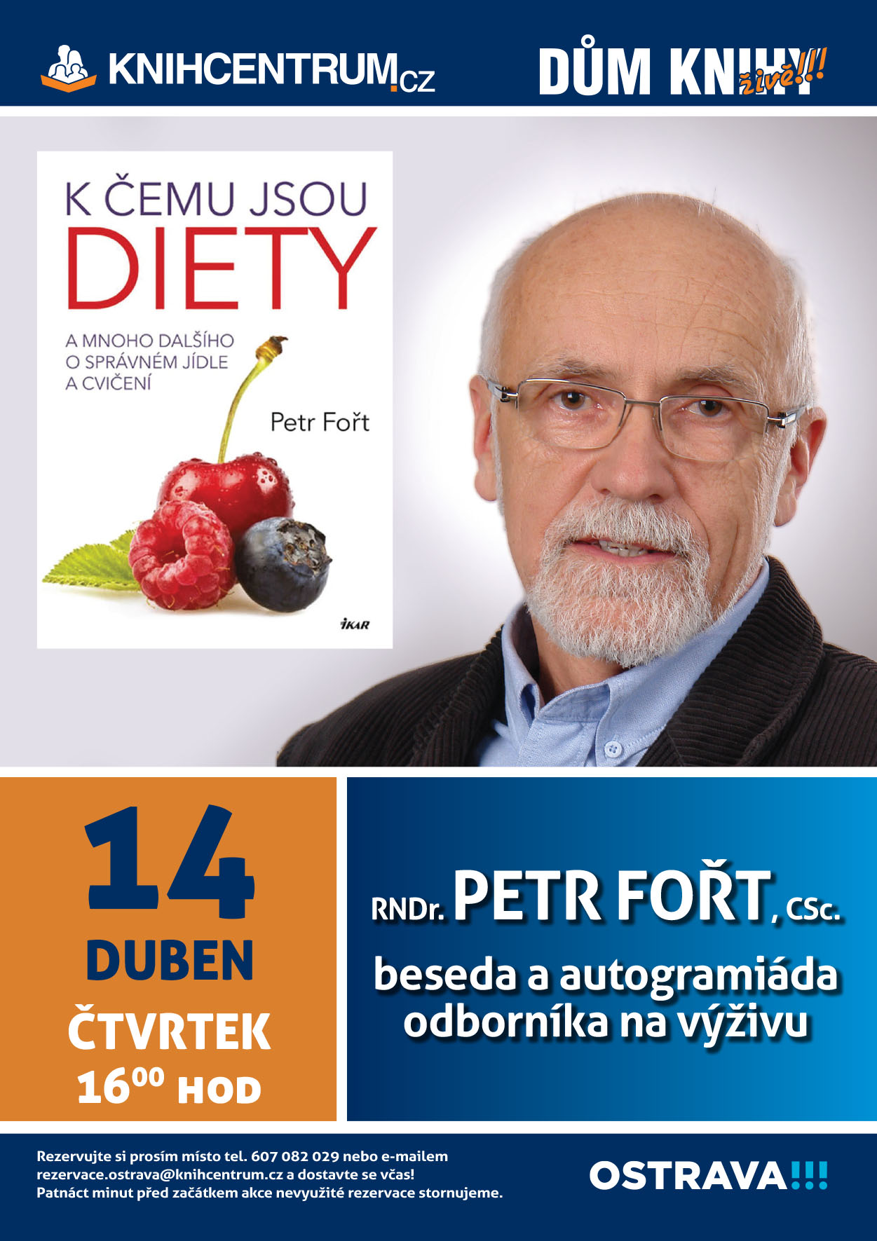 Rezervujte si místo e-mailem rezervace.ostrava@knihcentrum.cz nebo telefonicky 607 082 029. Upozornění – 15 minut před začátkem akce rezervace propadají, dostavte se prosím včas!